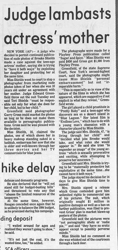 यह तस्वीर कई लोगों में से एक है जिसे ग्रॉस ने शील्ड्स की मां, टेरी शील्ड्स की सहमति से लिया था। 1981 में, शील्ड्स ने सकल पर मुकदमा दायर किया, यह तर्क देते हुए कि फोटोग्राफर को छवियों से लाभ जारी रखने की अनुमति नहीं दी जानी चाहिए। यह तस्वीरें उसके अपूरणीय नुकसान का कारण बनेंगी। मुकदमा खारिज कर दिया गया था। न्यायमूर्ति ने कहा कि चित्र 'संभवतया विकृत दिमाग' को छोड़कर 'कामुक या अश्लील नहीं' थे। और जब कि छवियों के कारण व्यक्तिगत शर्मिंदगी हो सकती है। तस्वीरों के लगने के वर्षों में शील्ड्स प्रोफ़ाइल में वृद्धि के कारण उन्होंने 'अपूरणीय क्षति' का गठन नहीं किया था। हम इन चित्रों को पोस्ट नहीं कर सकते, लेकिन वे ऑनलाइन और निःशुल्क हैं!
